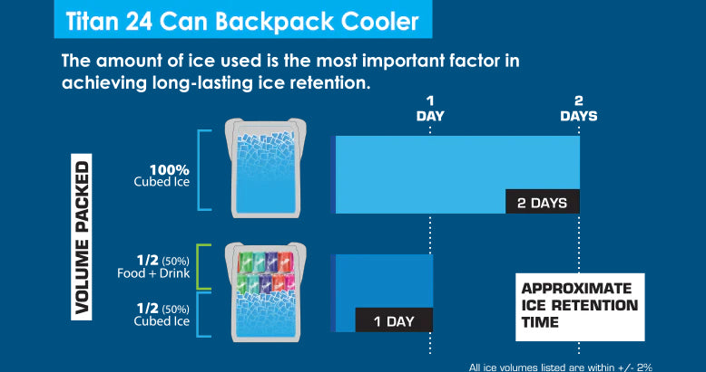 The 100% “Keeps Ice” test is an industry standard test that’s used as an effective way to compare the relative performances of different coolers. The real-life scenario shown above is provided to help you plan your cooler contents based on the amount of time you will need to keep the contents cold.